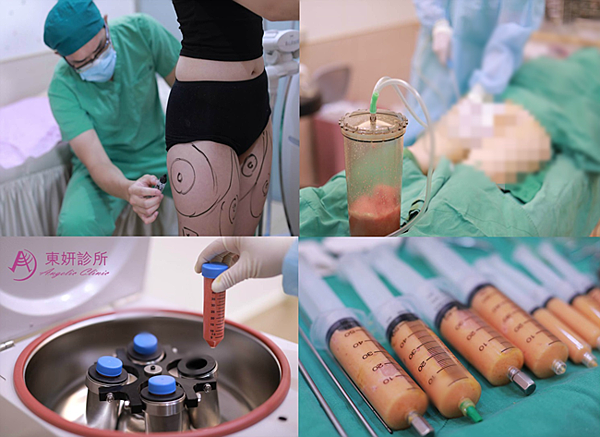 ▲自體脂肪豐胸手術的術前評估畫線、手術抽脂回填、脂肪離心等過程